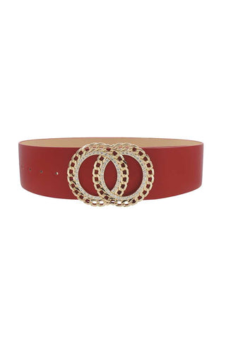Elevate your outfit with our Double Circle Chain and Rhinestone Trim Design Belt, a statement accessory that adds a touch of glamour to any look. Available in a variety of stylish colors, including Black, Cognac, Red, Mustard, Tan, Teal, and Wine, this belt is designed to enhance your style and make a lasting impression.