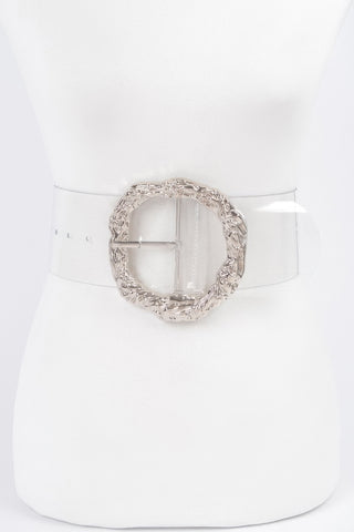 Product Description: Make a bold, fashion-forward statement with the Big Vintage Round Metal Buckle Clear Belt. Designed with a wide, transparent PVC strap and an oversized vintage-inspired round metal buckle, this belt combines retro charm with modern minimalism. The striking silhouette effortlessly cinches the waist, adding structure and standout style to dresses, blazers, or jumpsuits. Crafted from durable PVC and iron, it’s the perfect blend of edgy and elegant—ideal for turning everyday outfits into eye-catching ensembles.