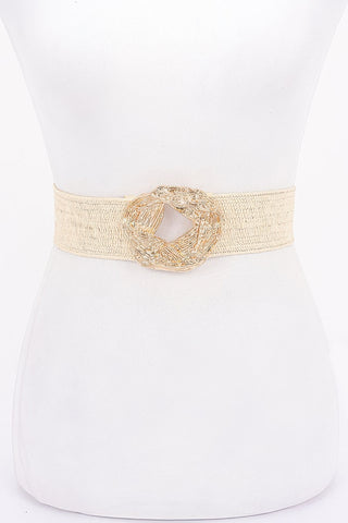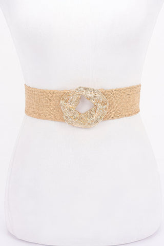 Design: Features a distinctive metal buckle and a faux straw texture, adding a natural yet modern vibe to your look. The elastic construction ensures comfort while maintaining a sleek silhouette.