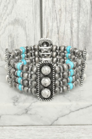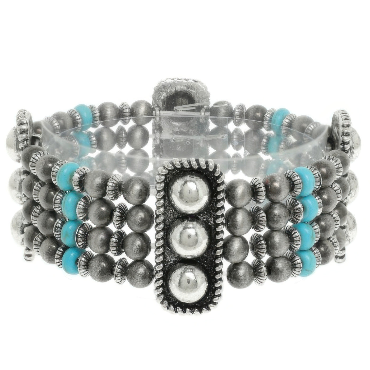 Product Description: Make a bold statement with this Western Rounded Rectangle Concho Bracelet. Featuring etched panels, turquoise accents, and a stretchable band, this piece delivers rustic charm and everyday comfort. Ideal for cowgirl style or southwestern flair, it’s an effortless way to elevate casual outfits or accessorize for events and festivals.