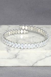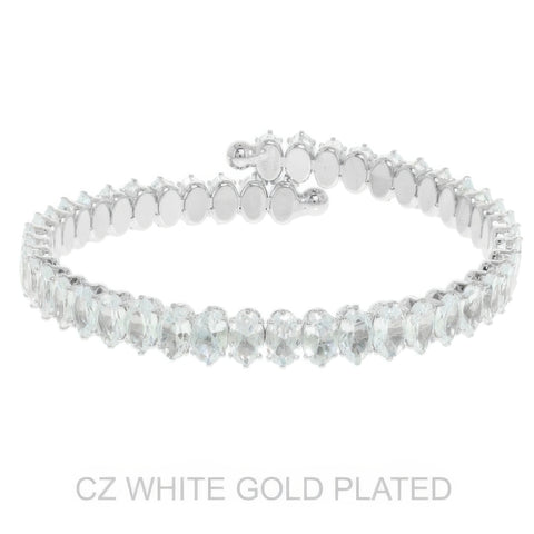 Product Description: Elegant and timeless, this White Gold Plated Tennis Bracelet showcases a series of oval-cut cubic zirconia stones set in a classic, refined design. Crafted for special occasions or everyday sophistication, it delivers brilliant shine with a lightweight feel. The sleek, uniform setting enhances its upscale appeal, making it a standout accessory for weddings, formal events, or romantic evenings. With its graceful profile and secure slip-on fit, this bracelet is a beautiful gift and lasting keepsake. Whether for bridal wear or a formal celebration, it adds a polished touch to any look.