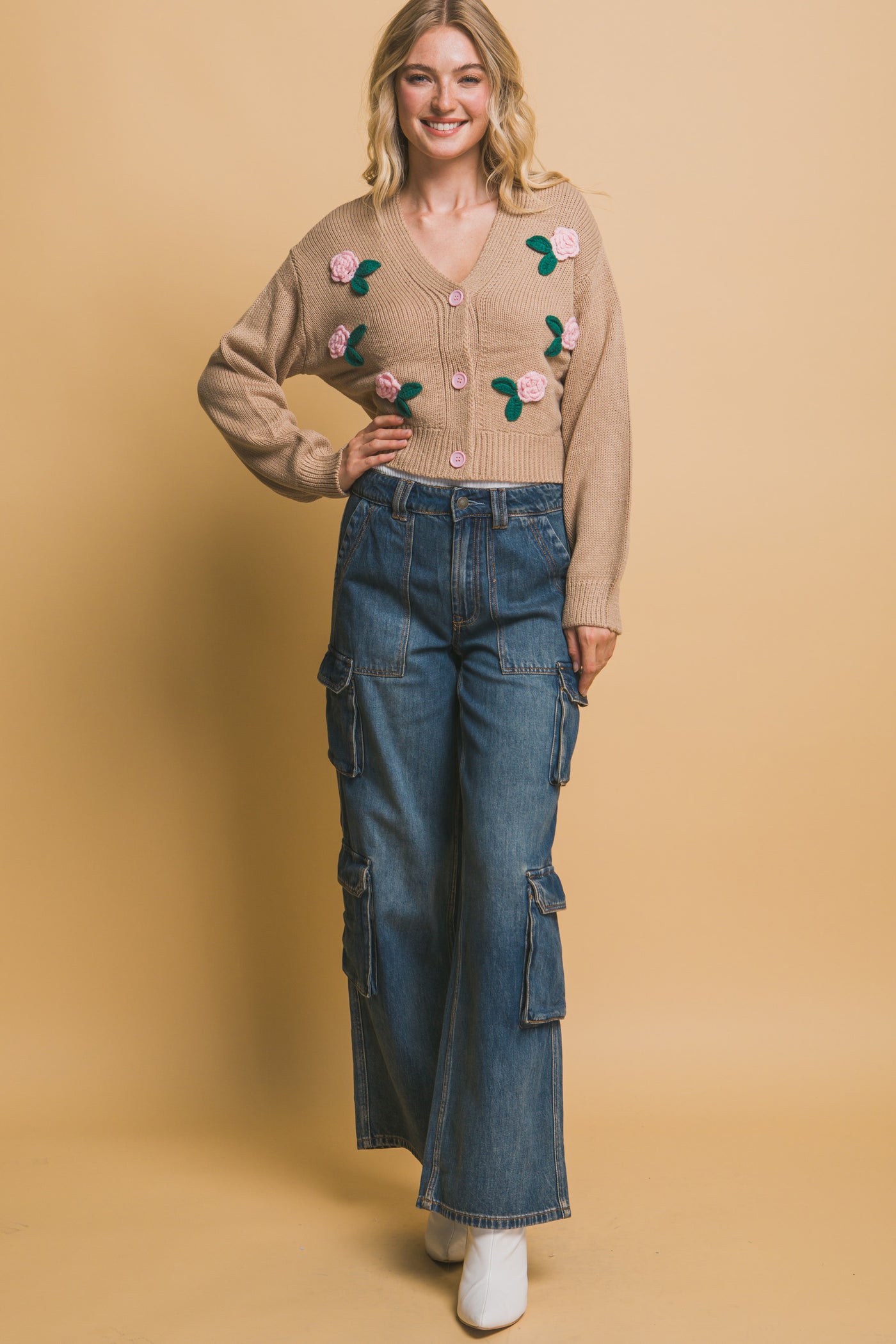 Update your wardrobe with the Mid Cropped Flower Cardigan. Add it to your cart now and enjoy the perfect blend of style and comfort!