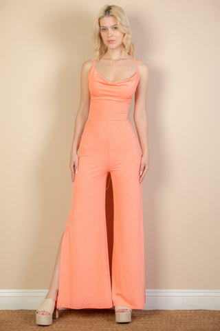 Make a statement with our Ribbed Cowl Neck Backless Split Wide Leg Jumpsuit. Add it to your cart now and experience a perfect blend of elegance, comfort, and contemporary design!