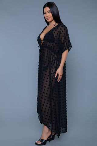 Product Description: Breezy and elegant, the Alice Cover-Up Maxi Dress is your perfect beach-to-brunch essential. Designed in a lightweight Swiss dot fabric, this kimono-style silhouette features a plunging V-neckline and short dolman sleeves for an airy, relaxed fit. The adjustable empire waist is finished with a front tie that allows you to customize the shape while maintaining effortless flow and movement. Ideal for layering over swimwear or pairing with sandals for warm-weather outings, this cover-up blends comfort with timeless style.