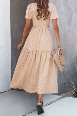 Ruffle Sleeve And Hem Top Shirred Crew Neck Dress - Khaki / S