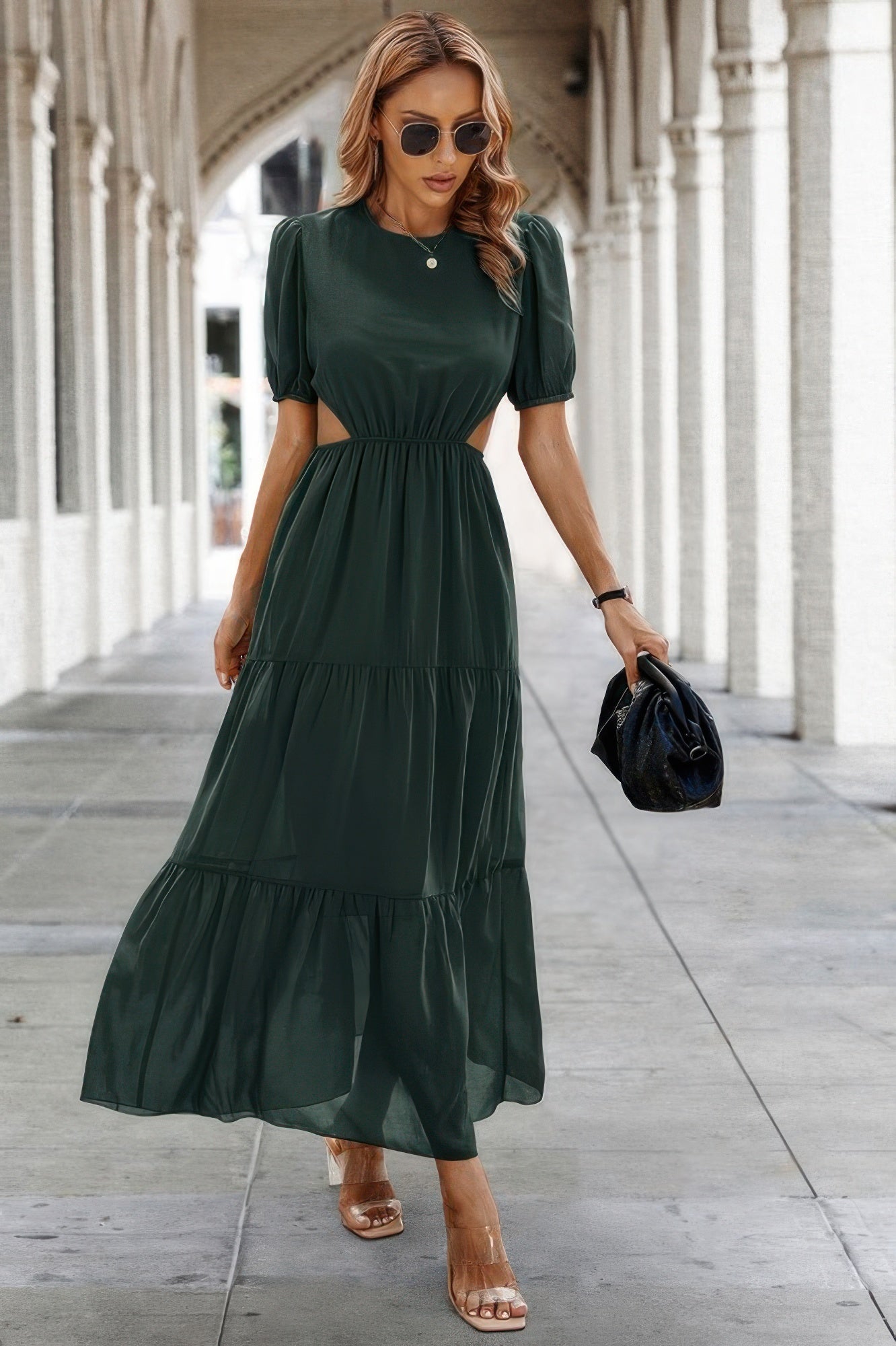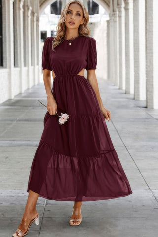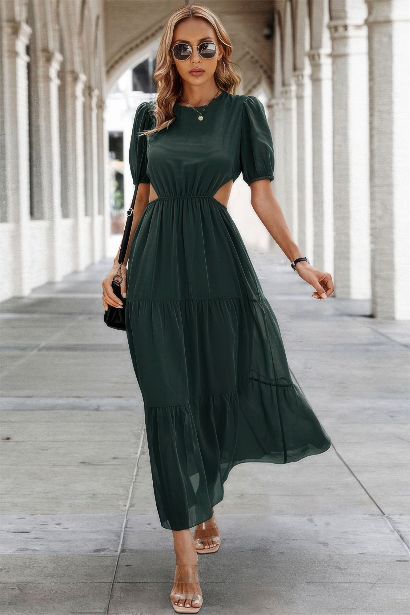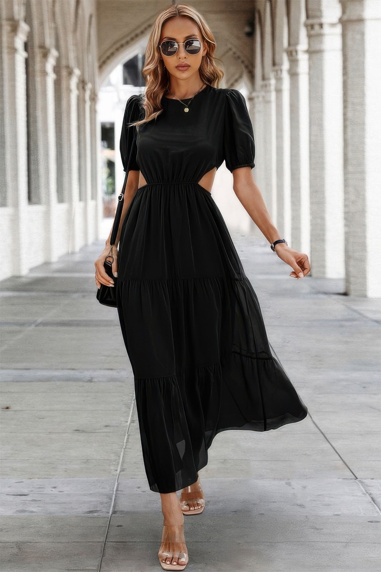 Product Description: Elevate your wardrobe with this charming Cut Out Waist Ruffle Hem Puff Sleeves Fit Dress, designed to bring a playful yet polished touch to your everyday style. Crafted from 100% polyester, this dress features delicate puff sleeves and a flattering cut-out waist that adds a hint of allure. The ruffle hem detail enhances its feminine silhouette, making it perfect for both casual outings and special occasions. Lightweight and comfortable, it moves effortlessly with you while maintaining its chic appearance. Whether you're heading to brunch, a vacation, or a day out, this dress offers the perfect blend of style and ease.