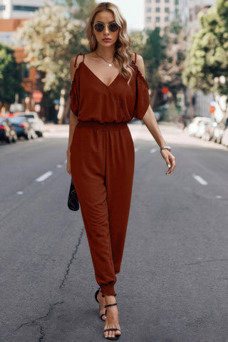 Solid Wrap V Neck Cold Shoulder Outfits Jumpsuit Sale