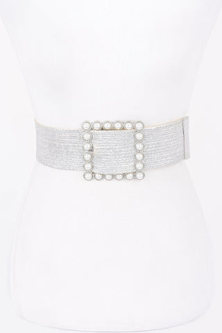 Wide Pearl Buckle Elastic Belt - Silver