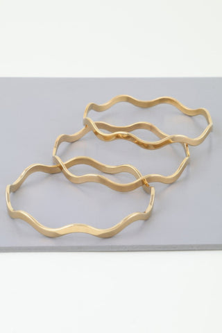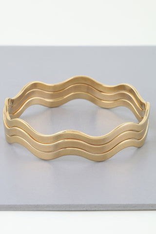 Product Description: Channel coastal elegance with the Triple Layer Wave Bracelet, a graceful accessory inspired by the movement of the sea. Featuring three interlocking layers in a flowing wave design, this bracelet brings a sense of rhythm and refined style to your look. Its sculptural form catches the light beautifully, adding a subtle shimmer that enhances any outfit. Whether worn alone or stacked with other pieces, it delivers timeless appeal with a modern twist. Designed for versatility, it transitions effortlessly from daywear to evening occasions.