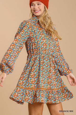Collared neckline button down floral print dress with crochet trimmed details - S