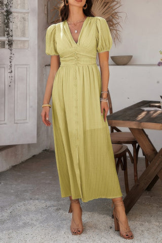 Product Description: Step into timeless elegance with this Solid V-Neck Puff Sleeves Knot Detail Dress. Crafted from soft polyester, this dress features romantic puff sleeves, a flattering V-neckline, and a chic knot detail at the waist. Perfect for a variety of occasions, it offers both comfort and standout style.