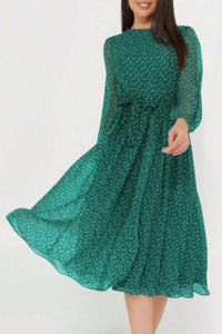 Product Description: Add a touch of classic charm to your wardrobe with this dot print lantern sleeve belted midi dress. Crafted from 100% polyester, this dress offers a lightweight and comfortable fit that's perfect for all-day wear. The playful dot print pairs beautifully with the elegant lantern sleeves, creating a balanced look that's both fun and sophisticated. The matching belt cinches the waist for a flattering silhouette, while the midi length keeps the style polished and versatile. Ideal for casual outings, vacations, or weekend gatherings, this dress brings effortless style to any occasion.