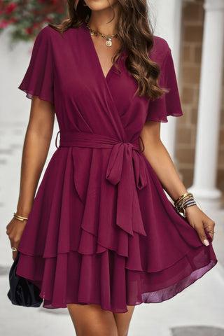 Chiffon Layer Hem Waist Tie Layer Hem Ruffle Dress