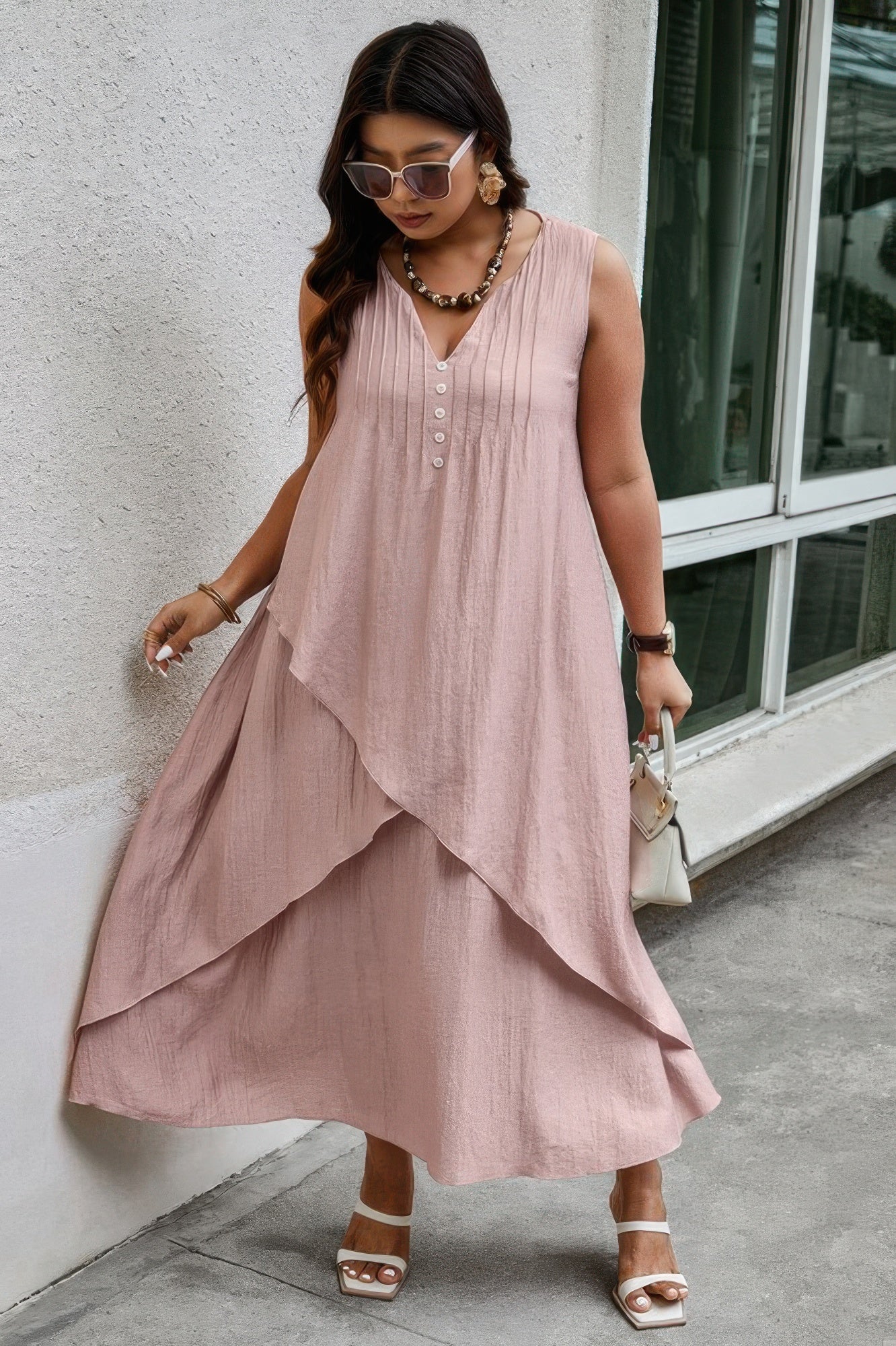 Product Description: Elegant and easy to wear, this plus-size sleeveless dress features a flattering wrap silhouette with a notched neckline and soft drape. Made from a viscose-rich blend, it’s designed to keep you comfortable while offering a refined, breathable feel. The loose fit creates effortless movement, making it a versatile choice for casual wear or warm-weather occasions.