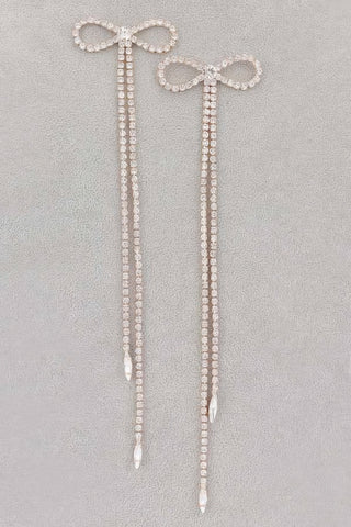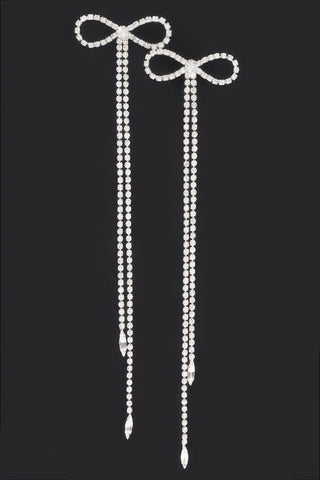 Product Description: Add runway-inspired glamour to your look with the Rhinestone Bow Fringe Earrings. Featuring a sparkling rhinestone bow at the top and cascading fringe chains below, these earrings are made to make a statement. Their long, flowing design adds dramatic movement, making them perfect for evenings out or fashion-forward styling.