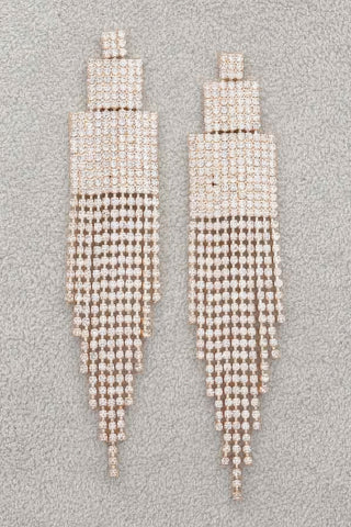 Product Description: Turn heads with the Radiant Elegance: Rhinestone Dazzle Earrings—a luxurious statement piece that captures light and attention effortlessly. Measuring approximately 0.85" x 4.5", these elongated earrings are adorned with cascading rhinestones that create a dazzling effect with every movement. Their dramatic length and refined sparkle make them the perfect accessory for formal events, special occasions, or a bold night-out look. Lightweight yet impactful, these earrings bring high-glamour energy while remaining comfortable to wear all evening long.