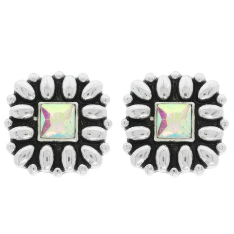Product Description: Elevate your Western-inspired look with the Western Floral Square Post Earrings, beautifully detailed with crystal or turquoise accents. Crafted in oxidized silver-tone metal, these earrings combine floral charm with rustic elegance. Their secure post design ensures all-day comfort, while the lightweight build makes them perfect for extended wear. Whether for a rodeo, festival, or country music event, these earrings bring a touch of sparkle and heritage style to any outfit.