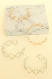 Product Description: The Clover Cutout Hoop Earrings offer a fresh twist on the classic hoop. Featuring openwork quatrefoil cutouts in gold-tone or silver-tone metal, these hoops combine modern minimalism with a touch of luck-inspired charm. Their lightweight frame and polished finish make them versatile enough for both day-to-night styling. Perfect for casual outings, work settings, or formal events, these earrings are a chic addition to any jewelry collection.