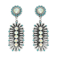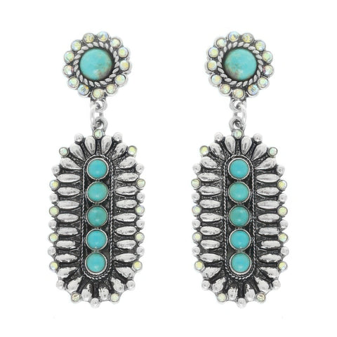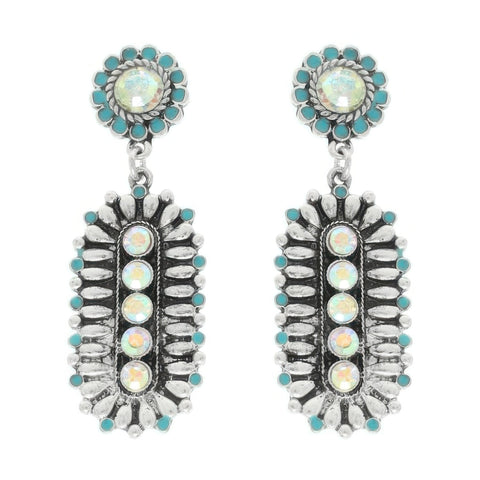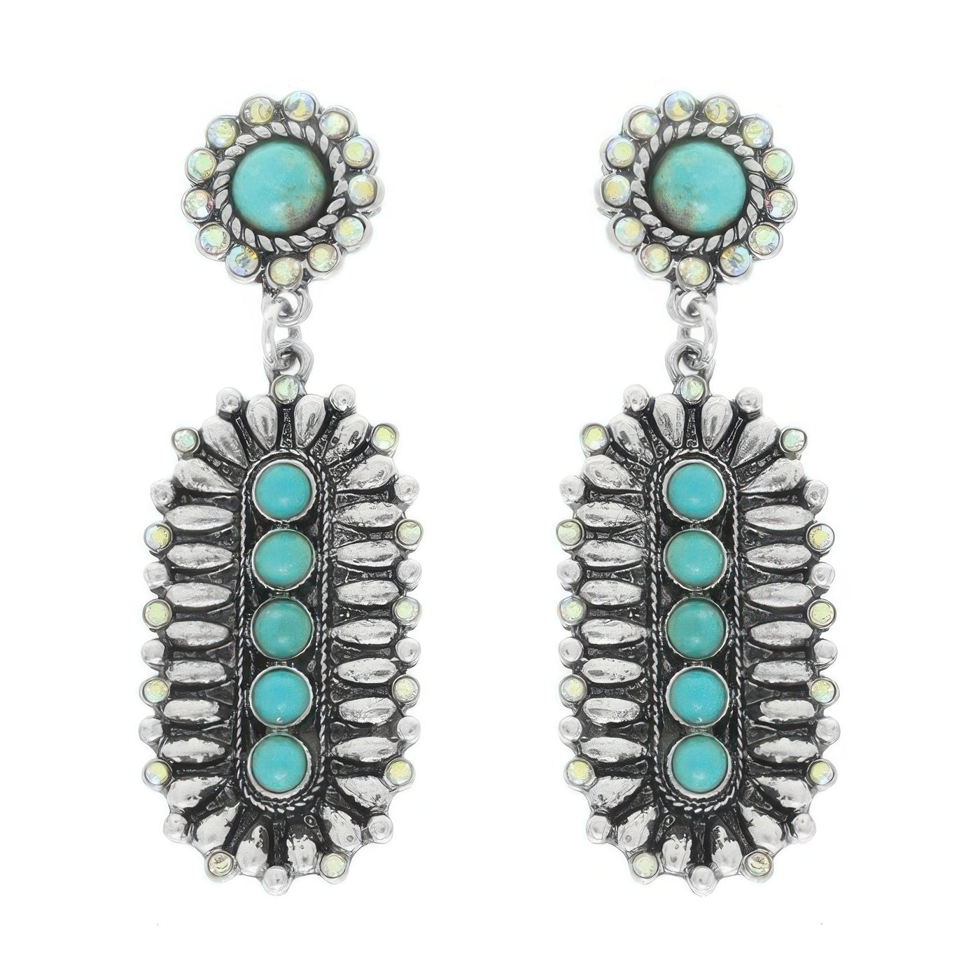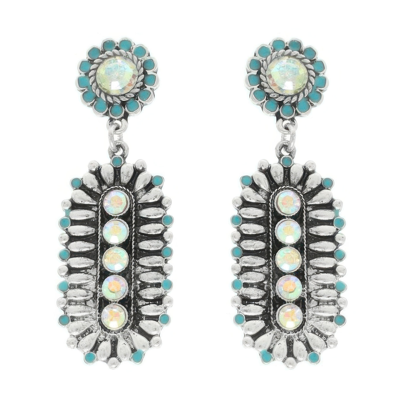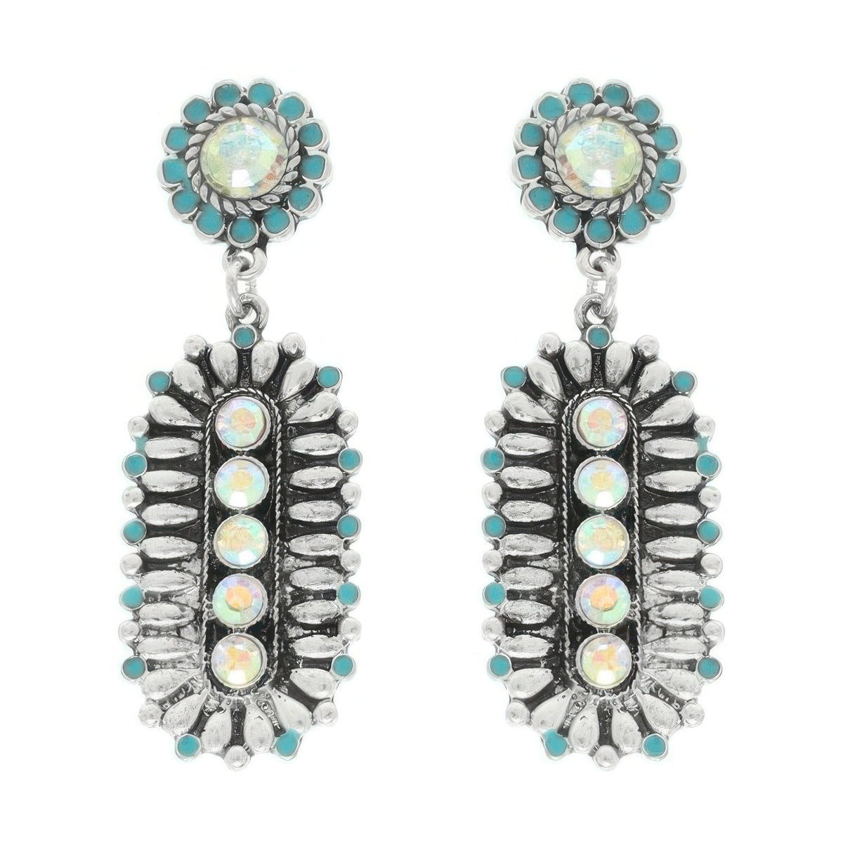 Product Description: The Western Jeweled Oval Concho Earrings offer vintage-inspired charm with a touch of sparkle. Featuring turquoise crystal embellishments and iridescent detailing, these oxidized silver-tone earrings are perfect for adding flair to Western and boho outfits. Their lightweight feel ensures comfort, while the intricate metalwork provides timeless style for festivals, rodeos, and everyday wear.