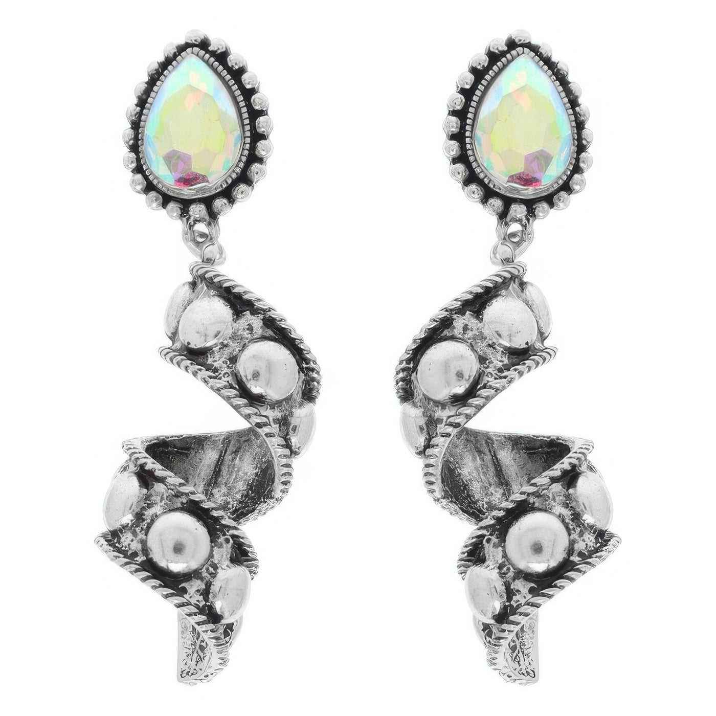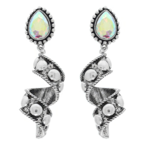 Product Description: The Western Teardrop Spiral Post Earrings blend rustic charm with elegant sparkle. Featuring a teardrop-cut crystal in a spiral design, these oxidized silver-tone earrings are perfect for adding a statement to your look. Their lightweight design makes them comfortable for all-day wear, while the shimmering crystal ensures they catch the light beautifully. Ideal for weddings, concerts, or a night out.