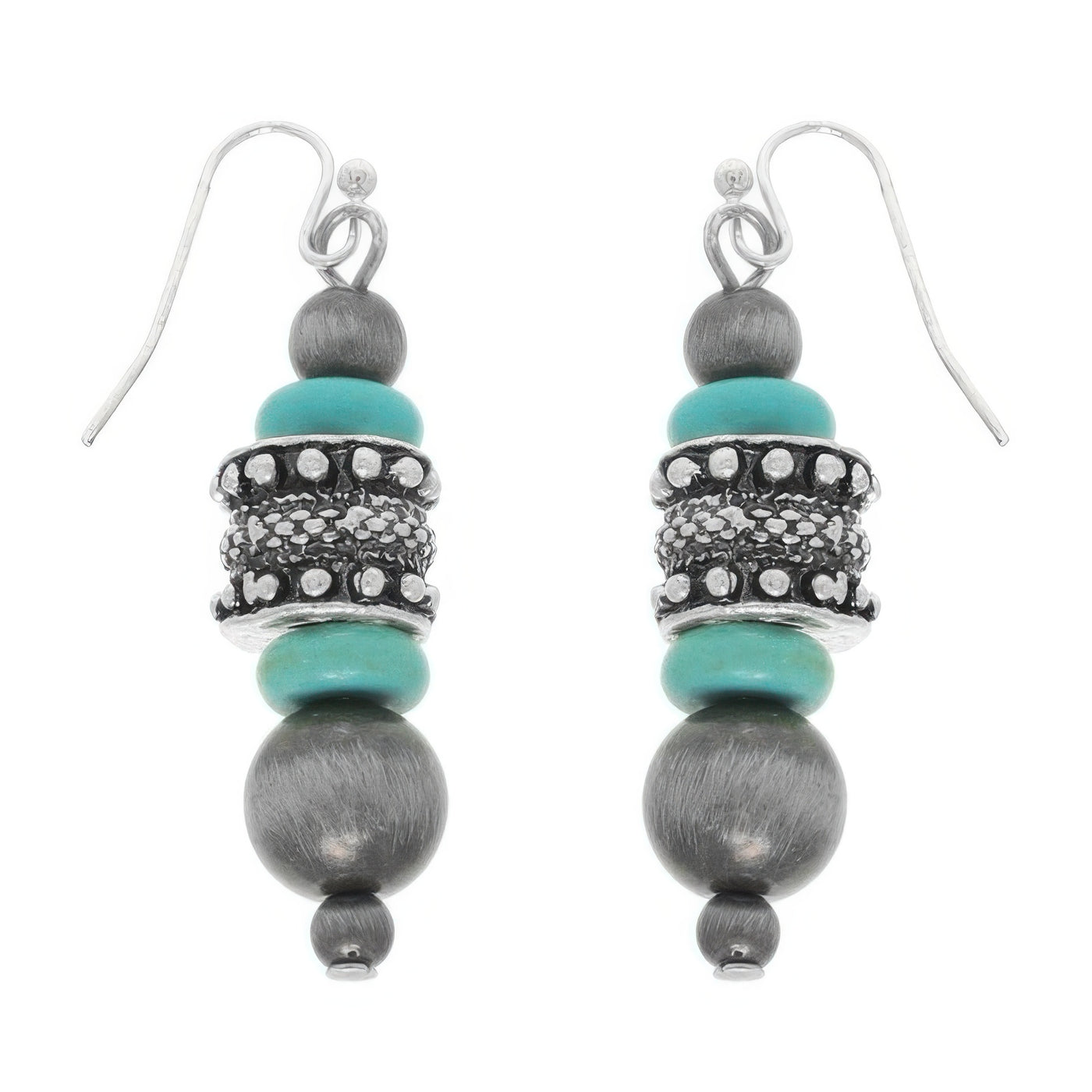 Stacked turquoise bead design with burnished silver-tone accents