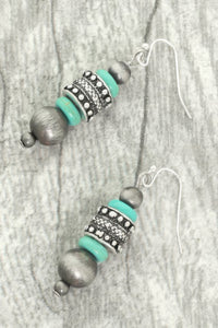 Product Description: The Western Jeweled Beaded Dangle Earrings bring a natural yet stylish touch to your look. Featuring stacked turquoise beads with burnished silver-tone accents, these earrings blend boho and Western elements beautifully. Lightweight and well-balanced, they’re perfect for everyday wear, festivals, or Western-themed events. Their simple yet eye-catching design makes them a versatile accessory for any wardrobe.