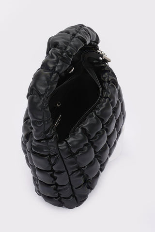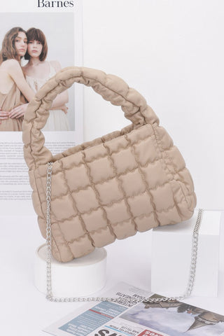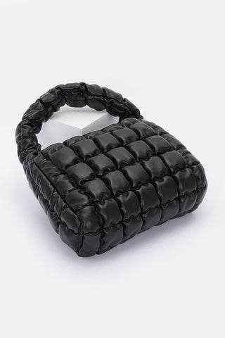 Product Description: Refined and compact, the Quilted Faux Leather Padded Handle Bag offers a chic solution for carrying your daily essentials. Designed with a luxe quilted finish and structured shape, this stylish accessory is as functional as it is fashionable. Measuring 9” wide by 6” high with a 3” depth, it features a padded top handle and a sleek chain strap for versatile carrying options. Crafted from durable polyurethane and accented with mixed metal hardware, it includes a designated space for slim items like a small tablet or magazine. Perfect for on-the-go days or evening outings, this bag brings a polished edge to every look.