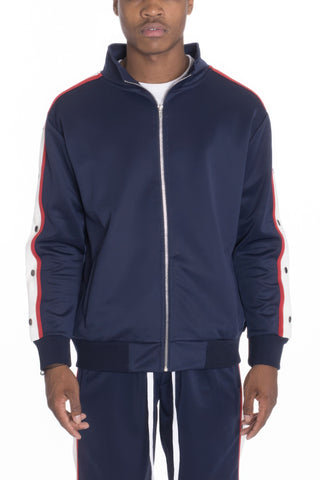 Product Description: The Snap Button Track Jacket delivers classic athletic style with functional details and a modern fit. Designed for versatility, this full-zip jacket features standard side pockets for convenience and snap button accents for a sporty touch. Whether you're warming up, cooling down, or heading out, its structured design and comfortable fit make it a go-to layer for any casual or active look. Clean lines and quality construction ensure it wears well season after season.
