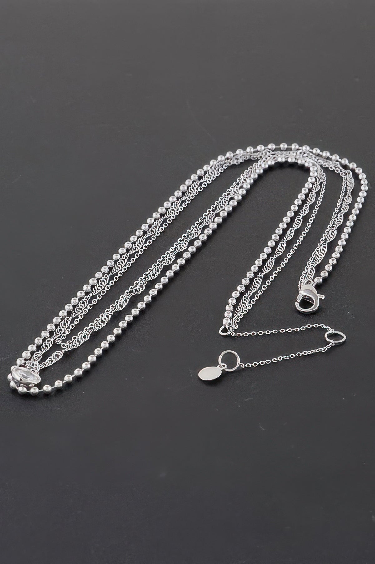 Triple Crystal Chain N Bead Necklace - Silver Clear