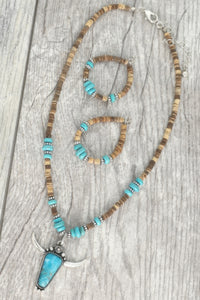 Product Description: Capture bold Western style with this wood bead mix longhorn necklace and earring set. Featuring turquoise-toned semi-stone beads and oxidized silver-tone accents, the statement necklace showcases a striking longhorn steer pendant. The coordinating teardrop earrings complete the look with a rustic yet refined charm. Adjustable for a perfect fit, this set blends traditional Southwestern motifs with modern flair. Whether you're headed to a rodeo or just adding some edge to your outfit, this piece delivers unmistakable character.