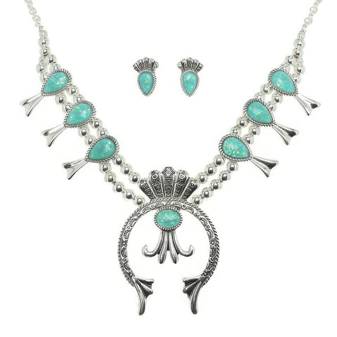 Product Description: Infuse your look with Southwestern spirit with this Western squash blossom necklace and earring set. Designed with metallic beading and foil-accented epoxy gemstones, this bold piece captures the essence of cowboy charm and desert elegance. The statement squash blossom pendant anchors the design, while coordinating drop earrings enhance the overall impact. Perfect for rodeo nights, festivals, or everyday Western flair, this set adds heritage-inspired drama to any outfit.