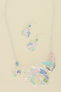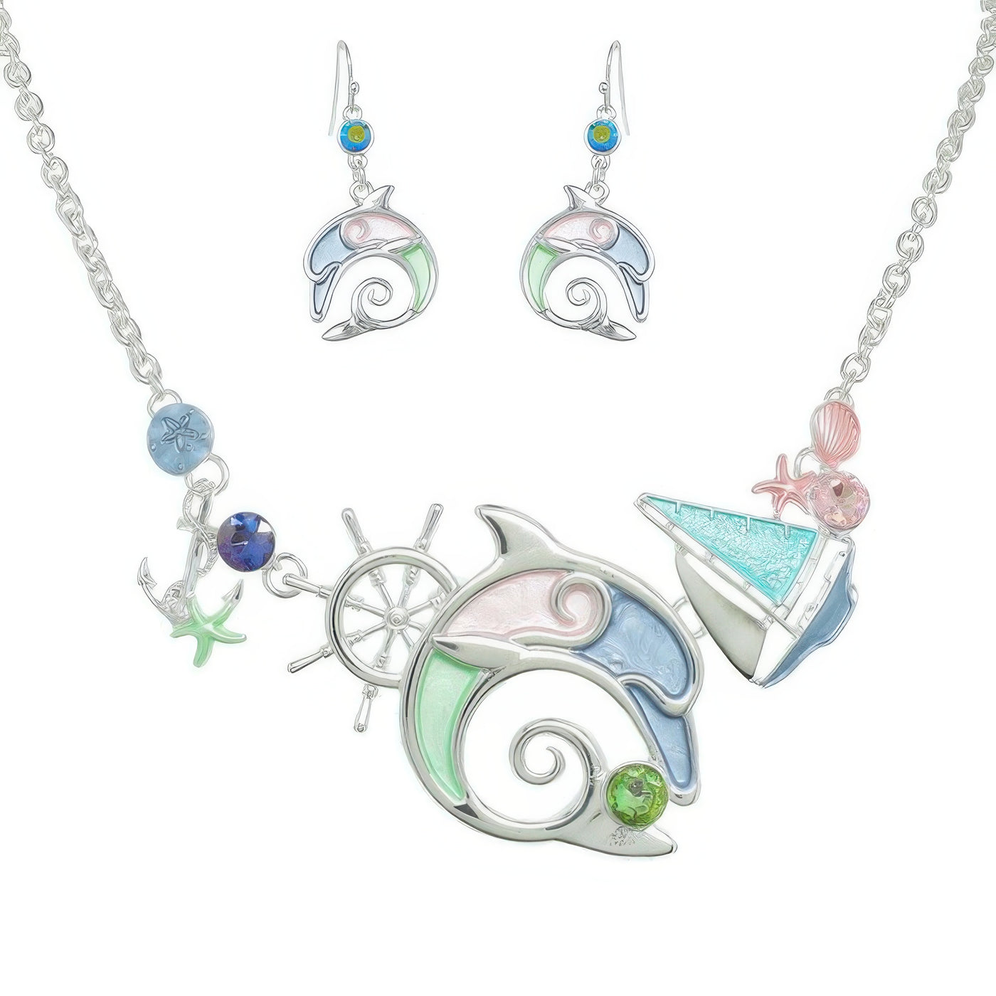 Product Description: Capture the spirit of the sea with this dolphin-themed bib necklace and earring set. Featuring playful dolphins, starfish, and seashells, this set is adorned with iridescent enamel and rhinestones for a brilliant marine glow. The silver-tone bib necklace offers a generous 2" drop, while matching earrings complete the beach-ready look. A whimsical, oceanic accessory perfect for summer events, vacations, or nautical-themed parties.