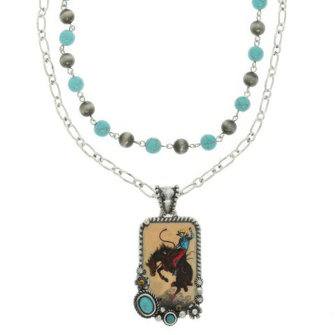 Product Description: Capture the spirit of the West with this Western Rodeo Cowboy Beaded Necklace. Featuring multistrand beading, turquoise accents, and a tooled leather inlay pendant, this statement piece channels rugged charm and boho style. With a bold 4.5" drop and artisan feel, it’s the perfect accessory for festivals, fairs, or everyday southwestern flair.