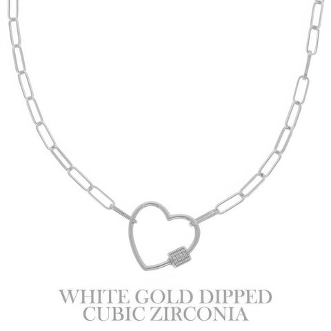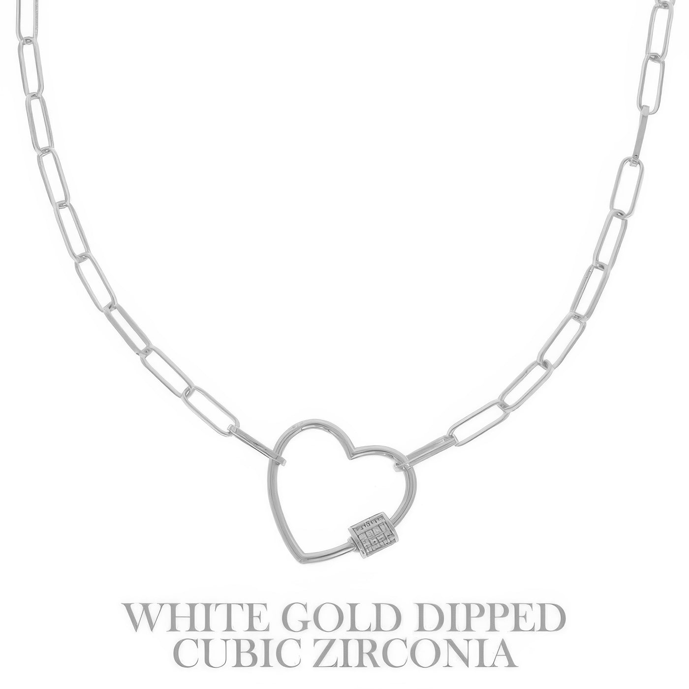 Product Description: This heart cutout padlock pendant necklace blends minimalist elegance with romantic flair. Sparkling cubic zirconia outlines the heart-shaped design, while the lock motif adds a symbolic touch of love and security. Crafted in white or yellow gold plating, it layers beautifully with other necklaces or stands on its own as a thoughtful gift. Perfect for date nights, Valentine’s Day, or everyday style with a loving twist.