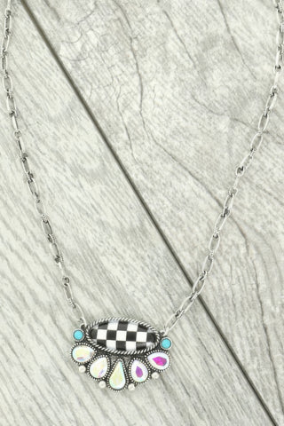 Product Description: The Western Theme Checkered Oval Pendant Necklace blends rustic style with a touch of elegance. This oxidized silver-tone piece features a classic black-and-white checkered oval pendant highlighted by a turquoise teardrop crystal accent. Its adjustable chain allows for comfortable wear and easy layering. Lightweight yet striking, this necklace is perfect for adding a pop of color and pattern to your outfit, whether for a casual day out or a Western-themed event.