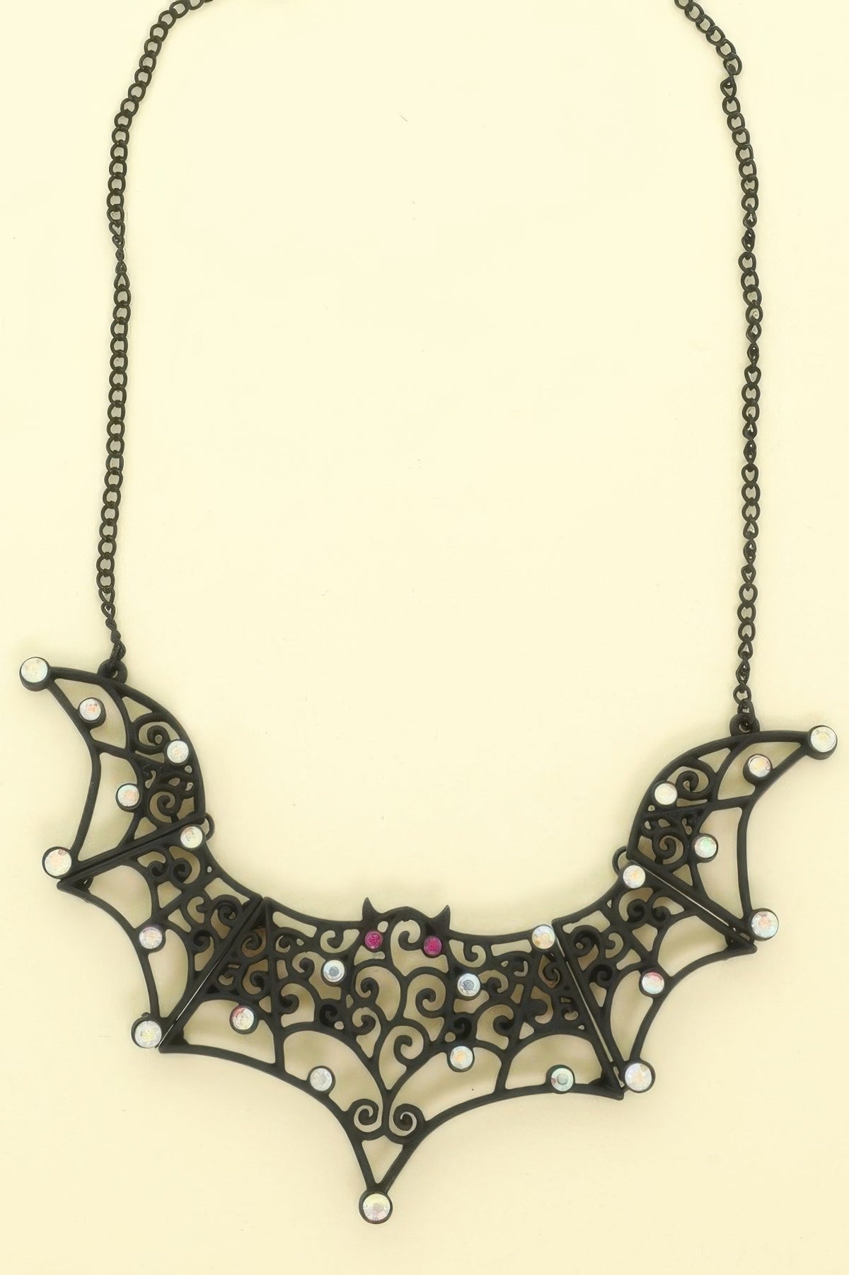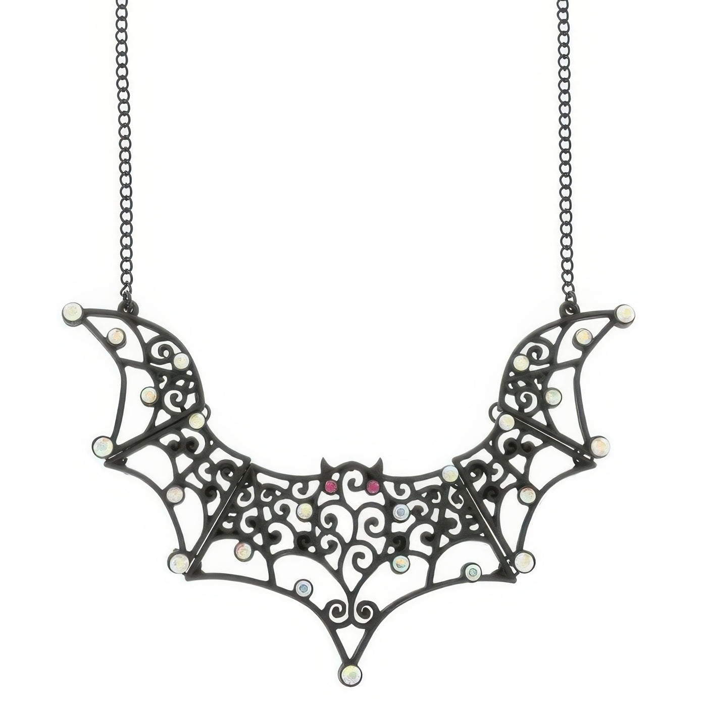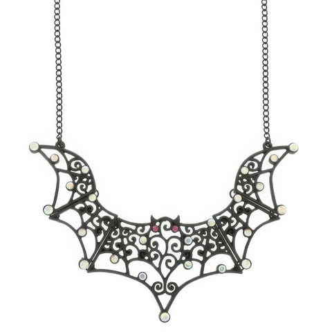 Matte black bat pendant with filigree detailing and rhinestone accents