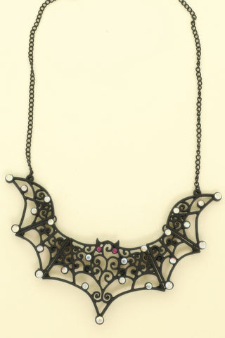 Product Description: Channel a dark and daring look with this rhinestone-detailed bat pendant necklace. Featuring a matte black filigree bat with intricate wings and a bold 2.5" drop, this striking piece brings dramatic edge to any Halloween or alt-inspired outfit. Sparkling rhinestone accents add just the right touch of glam, while the lightweight chain ensures comfort all night. With a 16" chain and 3" extender, it layers easily with chokers or stands alone as a bold centerpiece. Ideal for Halloween lovers, goth fashion fans, and nightlife creatives.