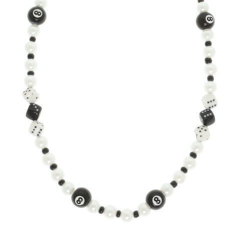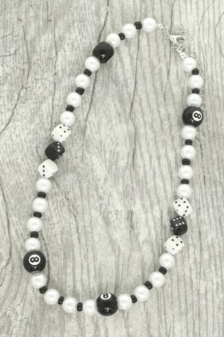 Beaded necklace with 8-ball and dice charms