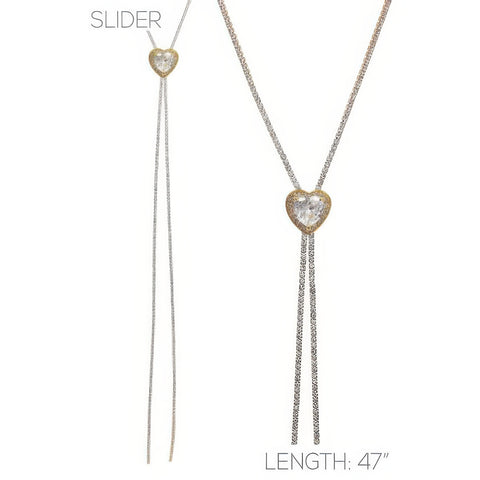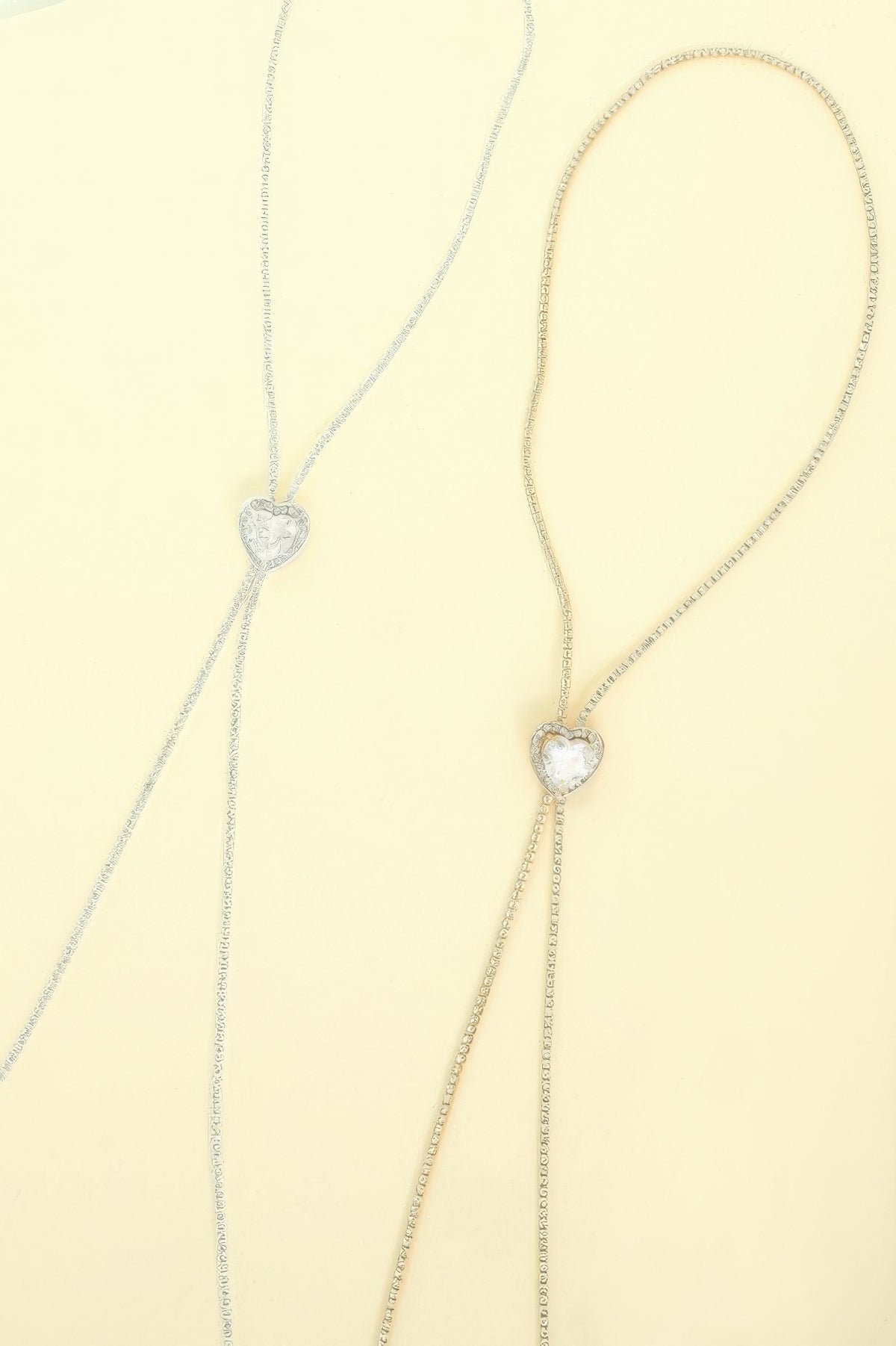 Product Description: Delicate yet impactful, this crystal heart bolo necklace is a romantic addition to your jewelry collection. The bezel-set rhinestone heart sparkles on a sleek, adjustable lariat chain, offering versatility and a refined finish. Whether layered or worn solo, this necklace adds understated glamour for date nights, bridal showers, or elegant events.