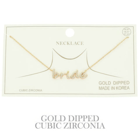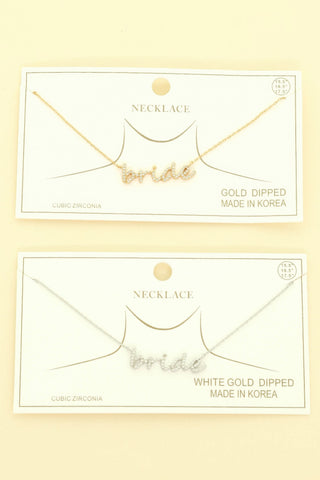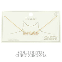 Product Description: Celebrate the big day with this charming CZ Gold Plated "Bride" Pendant Necklace. Featuring cubic zirconia pave lettering on a sleek chain, this necklace adds a glamorous sparkle to bachelorette parties, bridal showers, or wedding day looks. Available in white or yellow gold plating, it's a thoughtful gift for the bride-to-be. Made in Korea with a delicate drop and high-polish finish, this piece is the perfect bridal keepsake.