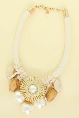 Product Description: Our Handmade Fabric Flower Necklace in cream and gold radiates bohemian charm with a sunburst floral centerpiece. Lightweight and woven with care, this artisan-crafted piece is perfect for beach weddings, music festivals, or casual summer outings.