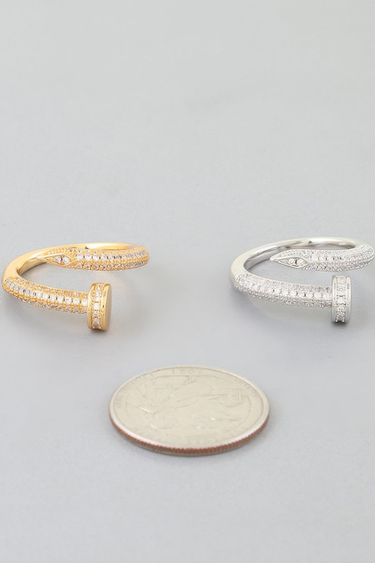 Product Description: Make a bold yet elegant statement with the Bejeweled Nail Wrap Ring, a striking piece that blends strength and sophistication. Crafted with a radiant gold-tone finish, this ring features a unique nail-inspired wrap design adorned with shimmering accents. Its sleek, modern silhouette offers a powerful yet refined look, perfect for elevating any outfit. Lightweight and comfortable, it’s designed for both everyday wear and special occasions. Add a touch of daring elegance to your jewelry collection with this captivating ring.