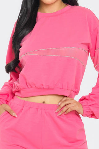 Experience the perfect blend of comfort and style with our Terry Mesh & Rhinestone Detail Set in Pink. Add it to your cart now and embrace cozy elegance!