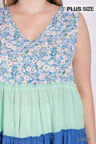 Get ready to turn heads and make a statement with our Floral Color Block Ruffle Detail Tiered V-Neck Top in Blue Mix. Add it to your cart now and experience the perfect blend of fashion and comfort!
