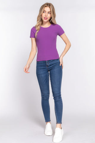 Add a touch of style to your wardrobe with our Short Sleeve Crew Neck Variegated Rib Knit Top in Purple. Add it to your cart now and experience the perfect blend of fashion and comfort!