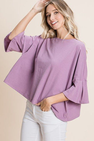 Add our Solid Cotton Casual Top with Pleated Bell Sleeves and Criss Cross Back Shorter Hem Detail in Lavender to your cart now and effortlessly elevate your casual style with comfort and flair!