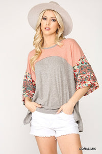 Colorblock Knit And Floral Print Mixed Top With Dolman Sleeve
