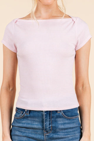 Product Description: A modern take on a classic, this boat neck striped tee delivers effortless style with a refined fit. The ribbed knit adds texture and stretch, while the soft rayon blend ensures all-day comfort. Designed with a clean boat neckline and waist-length cut, it’s an easy piece to pair with both high-rise denim and tailored bottoms. Short sleeves and a body-hugging silhouette make it perfect for layering or wearing on its own. Simple yet elevated, this tee is a must-have for versatile everyday dressing.