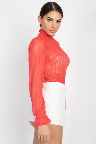 Introducing our Ruffle Mock Neck Lace Top, a sophisticated and stylish addition to your wardrobe. Crafted with care, this knit lace top features a mock neckline adorned with ruffle trim, shirred shoulders, long sleeves with bell cuffs, and a waist-length silhouette. The delicate design and high-quality fabric make this top a versatile choice for various occasions. Choose the vibrant and lively Coral color to infuse a touch of warmth and style into your ensemble.