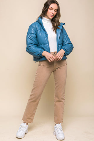 Why Choose the PU Faux Leather Zipper Hooded Puffer Jacket in Azure?